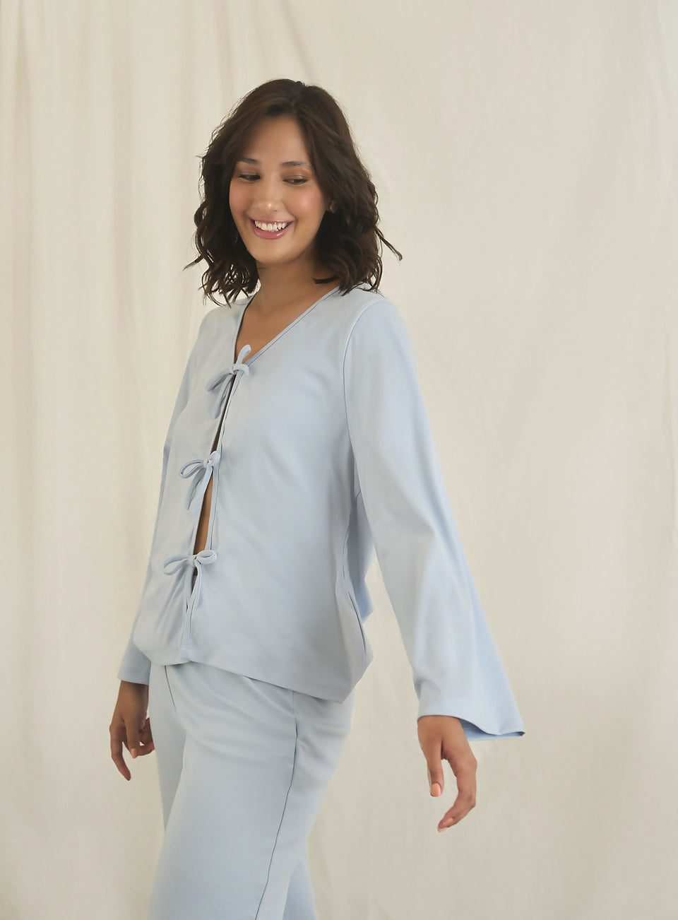100% Algodon Pima OrganicoTop suelto con detalle de lazos para amarrar, Pantalón de tiro alto...