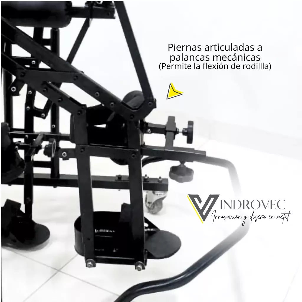 El bipedestador dinámico está diseñado para favorecer la bipedestación activa y el entrenamiento de la marcha en personas con movilidad reducida, su sistema mecánico permite simular el movimiento natural de caminar, promoviendo la descarga de peso alternada en cada pierna y estimulando la coordinación motora.
